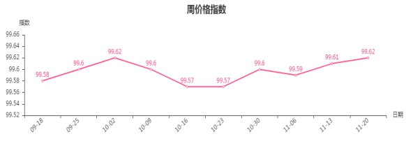 据临沂商城价格指数信息系统监测,本周(11月13日-11月20日)临沂商城周价格总指数为100.09点,环比上涨0.08点。