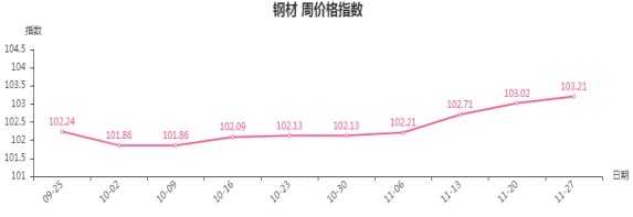本周,钢材类周价格指数收于103.21点,环比上涨0.19点。其中,建筑钢材、板材、管材、型材类指数分别上涨0.27、0.24、0.2、0.1点。