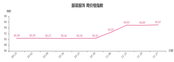 本周,服装服饰类周价格指数收于95.07点,环比上涨0.18点。从盘面看,服装类、服饰类指数分别上涨0.25点、0.01点,其中三级分类男装、内衣、男童装分别上涨0.92、0.62和0.36点,是拉动服装服饰类周价格指数上涨的主要因素。