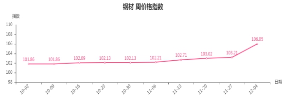 本周,钢材类周价格指数收于106.05点,环比上涨2.84点。从盘面看,板材类、建筑钢材类、管材类、型材类指数分别上涨4.2、3.47、2.82和1.55点。