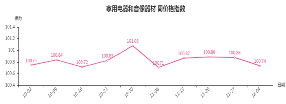 本周,家用电器和音像器材类周价格指数收于100.74点,环比下跌0.14点。其二级子类中厨房电器类、净化电器类、音像器材类、制冷电器类指数分别下跌0.42、0.27、0.12、0.11点,热水器、个人生活电器类指数分别上涨0.2、0.01点。
