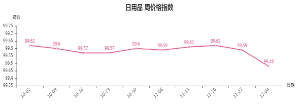 本周,日用品类周价格指数收于99.48点,环比下跌0.11点。其二级子类中:钟表眼镜类、卫生清洁日用品类指数分别下跌6.41点和0.07点;玩具类、家居生活用品类指数分别上涨0.11点和0.01点。
