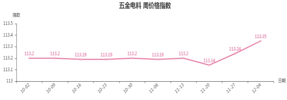 本周,五金电料类周价格指数收于113.35点,环比上涨0.11点。其二级子类中电线电缆类、仪器仪表类、电工电器类指数分别上涨1.33、0.28、0.03点。