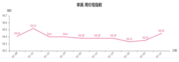 本周,家具周价格指数收于94.45点,环比上涨0.1点。其中,床及用品类、柜类、桌类、坐具类指数分别上涨0.19点、0.18点、0.05点、0.03点,是拉动家具类下跌的主要因素。