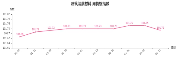 本周,建筑装潢材料类周价格指数收于101.72点,环比下跌0.03点。其二级子类中,装饰材料、结构安装材料类指数分别下跌0.02点和0.01点;专用材料类指数上涨0.02点。
