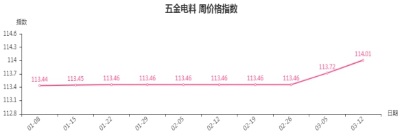 本周,五金电料类周价格指数收于114.01点,环比上涨0.29点。其二级子类中电线电缆类、焊机焊具和焊材类、五金工具类指数上涨,分别上涨2.14、0.34、0.14点,电工电器类指数下降0.03点。