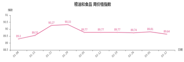 本周,粮油和食品类周价格指数收于89.64点,环比下跌0.17点。其二级子类中茶叶、粮油、罐头、干果类指数分别下跌0.32、0.22、0.05和0.05点。