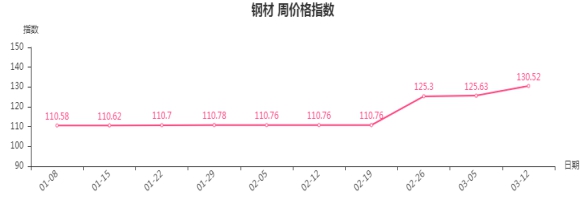 本周,钢材类周价格指数收于130.52点,环比上涨4.89点。钢材二级分类指数全线上涨,型材、管材、建筑钢材、板材类指数分别上涨5.77、5.51、5.09和3.02点。