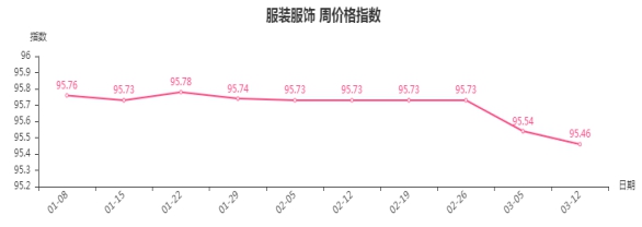 本周,服装服饰周价格指数收于95.46点,环比下跌0.08点。从盘面看,男装类、女装类、男童装类、女童装类分别下跌0.15点、0.15点、0.06点、0.03点,是拉动服装服饰类周价格指数下跌的主要因素。