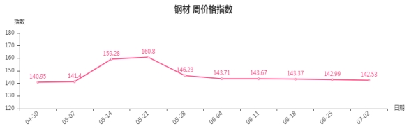 本周,钢材类周价格指数收于142.53点,环比下跌0.46点,跌幅0.32%。从盘面看,钢材三级分类中全部出现下跌,其中板材类指数跌幅最大,指数下跌1.07点,成拉动钢材指数下跌主力,建筑钢材类、型材类、管材类指数同步下跌,指数分别下跌0.46点、0.19点和0.16点。