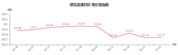本周,建筑装潢材料类周价格指数收于101.75点,环比上涨0.01点,涨幅0.01%。从盘面看,二级分类中结构安装材料类环比上涨0.02点,拉动整体指数上涨,结构材料类、结构安装材料类、装饰材料类指数均与上周持平。