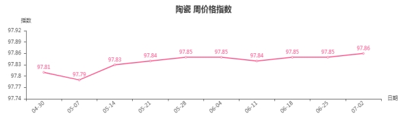 本周,陶瓷类周价格指数收于97.86点,环比上涨0.01点,涨幅0.01%。从二级分类看,陶瓷洁具、建筑陶瓷类周价格指数保持稳定;日用陶瓷周价格指数小幅上涨,环比上涨0.02点,涨幅0.02%。