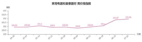 本周,家用电器和音像器材类周价格指数收于101.96点,环比上涨0.09点。其二级子类中制冷电器类、厨房电器类、个人生活电器类、音像器材类分别上涨0.45、0.22、0.13、0.01点,净化电器类、家居电器类、电风扇类、热水器类分别下跌0.23、0.07、0.05、0.04点。