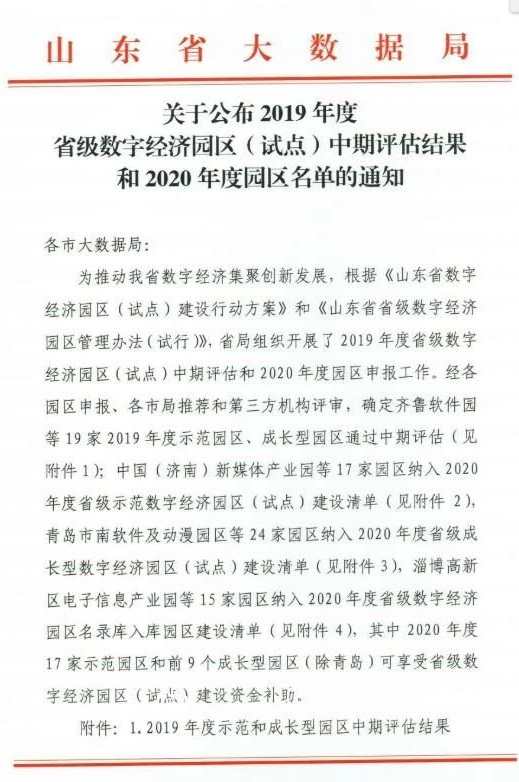 日前,山东省大数据局公布了2019年度省级数字经济园区(试点)中期评估结果和2020年度园区名单,龙湖软件园顺利通过了省级成长型数字经济园区(试点)中期评估,成功入选2020年度省级示范数字经济园区(试点)。从省级成长型数字经济园区到省级示范数字经济园区,龙湖软件完成了一次华丽升级!